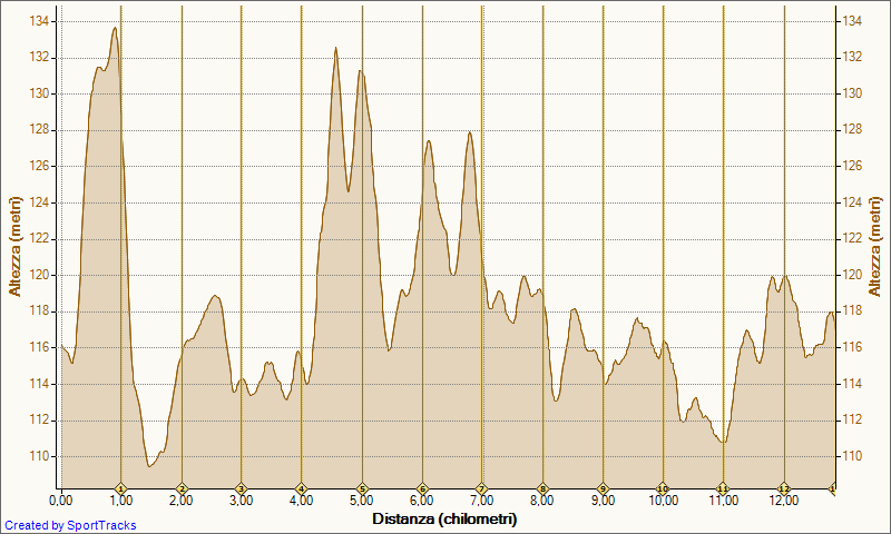 Nel'immagine il profilo altimetrico dei circa 13km; no, non avevo il Parkinson, era proprio un su e giù continuo.