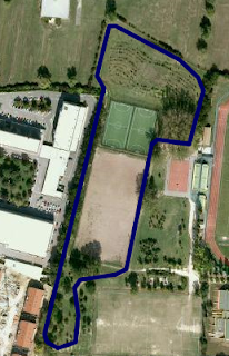 Oggi, domenica, era anche mattinata di calcio giovanile ed il gruppo di papà al seguito, attorno al mooolto fangoso campo di calcio che vedete in marrone al centro dell'immagine, dopo un mio primo momento di imbarazzo ha fornito un ulteriore stimolo per concentrarmi sullo stile e sulle velocità di corsa. In totale 5 ripetute da 800mt con 3' di recuperi, seguite da un rapido ritorno a casa per evitare il raffreddamento da pioggia.