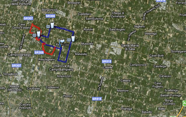 Il Graticolato (gran parte della foto, quelli colorati i percorsi di oggi) è una enorme scacchiera stradale posizionata fra le province di Padova, Venezia e Treviso, costruita dai Romani nel I secolo a.C. per delimitare le "centurie" (se desiderate approfondire ecco qua Wikipedia).