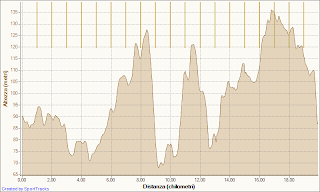I 21km li vedete in figura, però se osservate bene le altimetrie non erano impegnative, al massimo dislivelli di una cinquantina di metri, comunque un saliscendi continuo rompi-gambe, rompi-ritmo, ma non rompi-marroni, quantificabile con una maggiorazione dei tempi del 10-15% (calcolando sui primi); molto asfalto, 4-5 km strerrati, un kilometrino con fondo molto sconnesso, a grossi sassi ed un tratto molto bello in mezzo ad un bosco, con due torrenti in piena ai lati della strada, sembra impossibile che sia sufficente un minimo di altura per generare certe impetuosità d'acque.