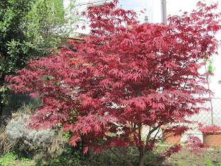 Solitamente gli aceri fanno foglie verdi che diventano rosse in tardo autunno, l'acero del mio giardino (foto) le ha sempre rosse, rosse come il sangue; in questo periodo è stupendo, le foglie giovani emanano colori lucidi e gioiosi.