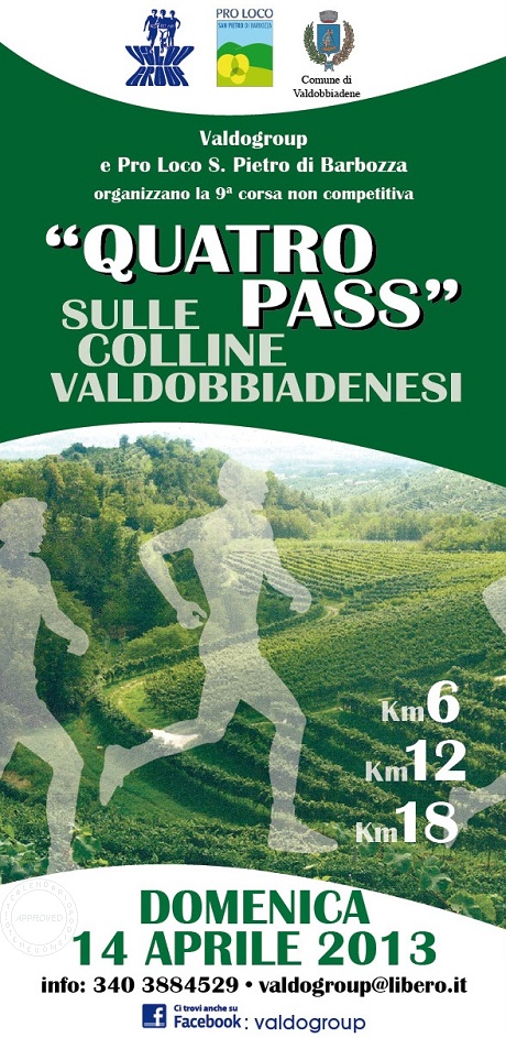 Mattinata sulle colline di Valdobbiadene, prima volta alla “Quatro Pass”; 12 km molto vari, molto sterrato, pochissimo fango, molti passaggi fra i vigneti del prosecco, saliscendi continui, alcuni molto ripidi sia in salita che in discesa. Un ulteriore ottimo allenamento inserito in un ottimo insieme organizzativo, premiato da oltre 3000 partecipanti.