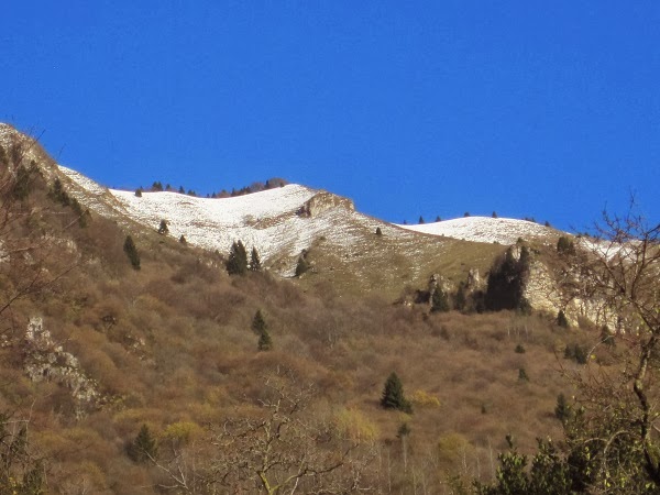 Percepire il trascorrere del tempo: foto da casa mia. Quella in testa, con il verde intenso del pino a risaltare sugli altri colori del tardo autunno, a parte l'azzurro del cielo ogni altro minimo pixel offre un colore diverso. Quella sotto, con la prima neve che aveva infarinato "le creste", subito sciolta sia dalle piogge sia dall'anacronistico tepore.