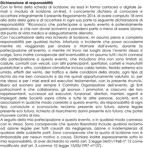 ... Rinuncio libero ed esonero per sempre il Comitato Organizzatore ... da responsabilità di ogni tipo ... reclamo ... azione legale ... richiesta di risarcimento. ... Questa liberatoria include qualsiasi reclamo od azione legale per fatti causati da negligenza, azione o inadempienza ...
