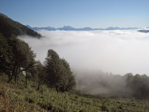 Il sentiero che porta alla malga, con la sua tremenda salitona dell'andata che diventa discesona "cauta" al ritorno; con in cima i paesaggi fino al mare, o che spaziano al di sopra di una "panna montata" di nuvole, con accompagnamento di scampanio di mucche al pascolo.