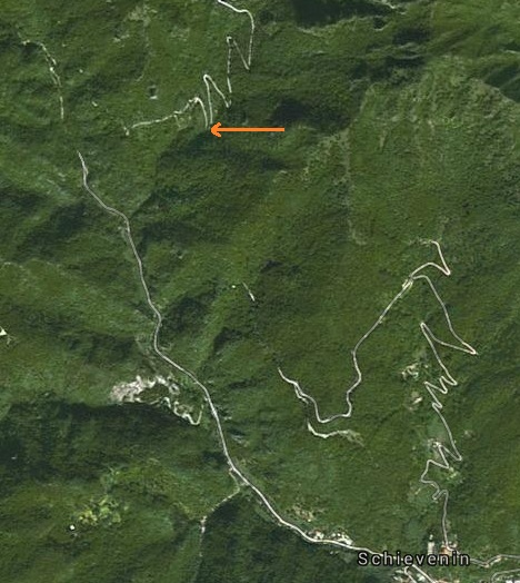 Dov'è Col di Dante? Lasciando l'auto a Schievenin proseguite sempre dritti, superate le palestre di roccia, su, su, verso Sassumà. Ad un tornante sinistrorso (nell'immagine indicato da una freccia) vedrete chiaro un sentiero sulla destra, prendetelo ed andate sempre dritti (ehm ehm, dritti per modo di dire) si sale ancora un po', poi si scende sempre. Qualche albero caduto da sottopassare senza difficoltà (volendo, ci sarebbe tanto di quel legname da utilizzare evitando certi scempi ...) ed ecco l'unica difficoltà: una ventina di metri di frana sassosa, con il sentiero un po' da "intuire" dove viene tagliato da un grosso tronco. In tutte le deviazioni scegliete sempre il sentiero che scende, vi ritroverete alla chiesa di Schievenin ed intuirete dov'è rimasta la vostra auto. Di corsa lo si fa in un'oretta abbondante, camminando ... il doppio.